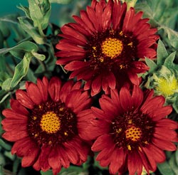 This Gaillardia cultivar is a hybrid typically growing 2-3' tall. Features large, daisy-like, solitary, deep wine red flowers (3-4" diameter) which appear on erect but often sprawling stems. Long summer bloom period. Gray-green basal leaves are narrow, lance-shaped, toothed and lobed.